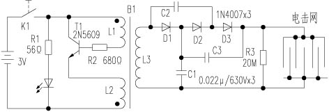 检修:测得升压变压器B1次级有520V电压,说明高频振荡电路工作正常,故障发生在倍压整流电路上,该机倍压整流电路由整流二极管D1、D2、D3(1N4007)和电容C1、C2、C3(0.022μF/630V)组成三倍压整流电路。查得D1已断路,其他元件未见异常,用一只1N4007更换D1后试机,电击网上高压恢复正常,故障排除。